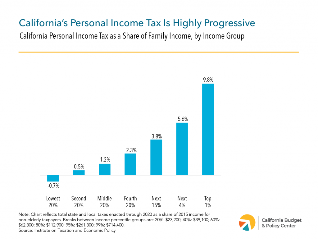 Californians with higher incomes pay a larger percentage of their income in personal income taxes than people with lower incomes because higher portions of income are subject to higher tax rates.2California’s personal income tax rates range from 1% to 13.3%. The top rate for each tax bracket, or range of income, is only applied to the amount of income that exceeds the income threshold for that bracket. In other words, high-income people face the highest effective tax rates with regard to the personal income tax. Additionally, the state has two refundable tax credits, the California Earned Income Tax Credit (CalEITC) and the Young Child Tax Credit, that provide refunds to families with very low incomes, creating a negative effective tax rate for them. The personal income tax is the state’s largest revenue source.